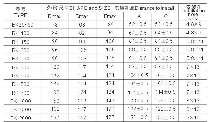 BK系列機(jī)床控制變壓器(以下簡(jiǎn)稱(chēng)變壓器)適用50-60Hz電壓至500V的電路中,通常用作機(jī)床控制電器或局部照明燈及指示燈的電源之用。BK變壓器結(jié)構(gòu)可分為殼式;按安裝方式可分為立式。旗正牌BK控制變壓器型號(hào)具體已列下圖里,詳情看下圖!